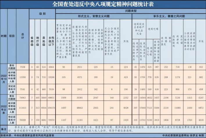 11月27日,中央紀(jì)委國(guó)家監(jiān)委公布了2022年10月全國(guó)查處違反中央八項(xiàng)規(guī)定精神問(wèn)題匯總情況。今年10月,全國(guó)共查處違反中央八項(xiàng)規(guī)定精神問(wèn)題7558起,批評(píng)教育幫助和處理11050人,其中,黨紀(jì)政務(wù)處分7541人,這是連續(xù)第110個(gè)月公布月報(bào)數(shù)據(jù)。